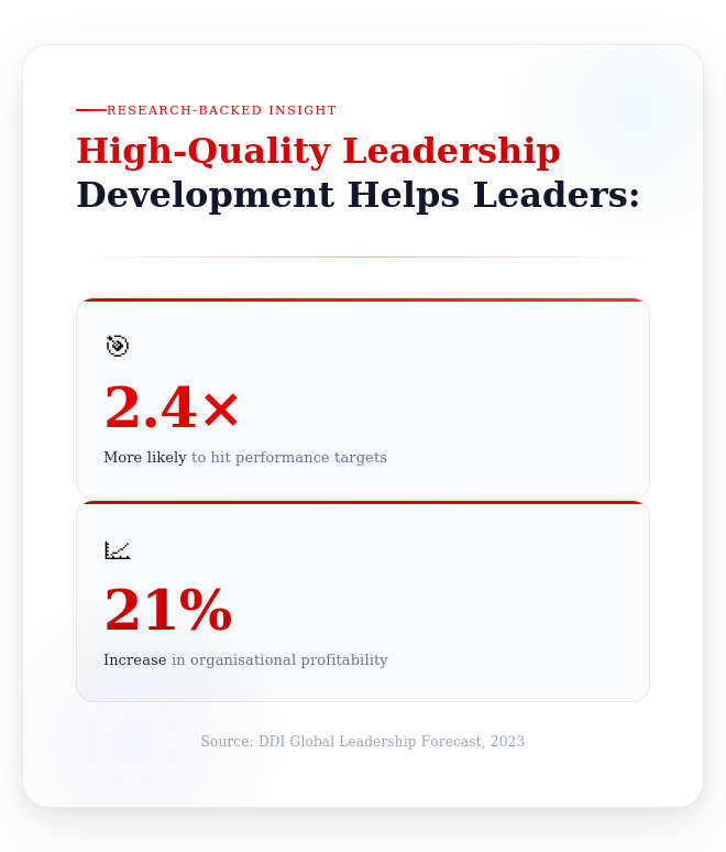 Organisations with high-quality leadership development are 2.4 times more likely to hit performance targets and often see a 21% increase in profitability.