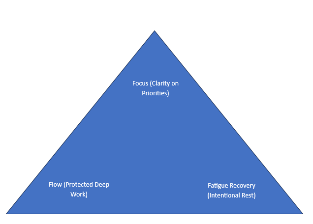 It’s a shift from being busy to being impactful. This means making purpose-driven choices that energise, not deplete, you and your team. We often visualise this as an “Efficiency Triangle,” where peak performance is the result of balancing sharp Focus, deep Flow, and intentional Fatigue Recovery.
